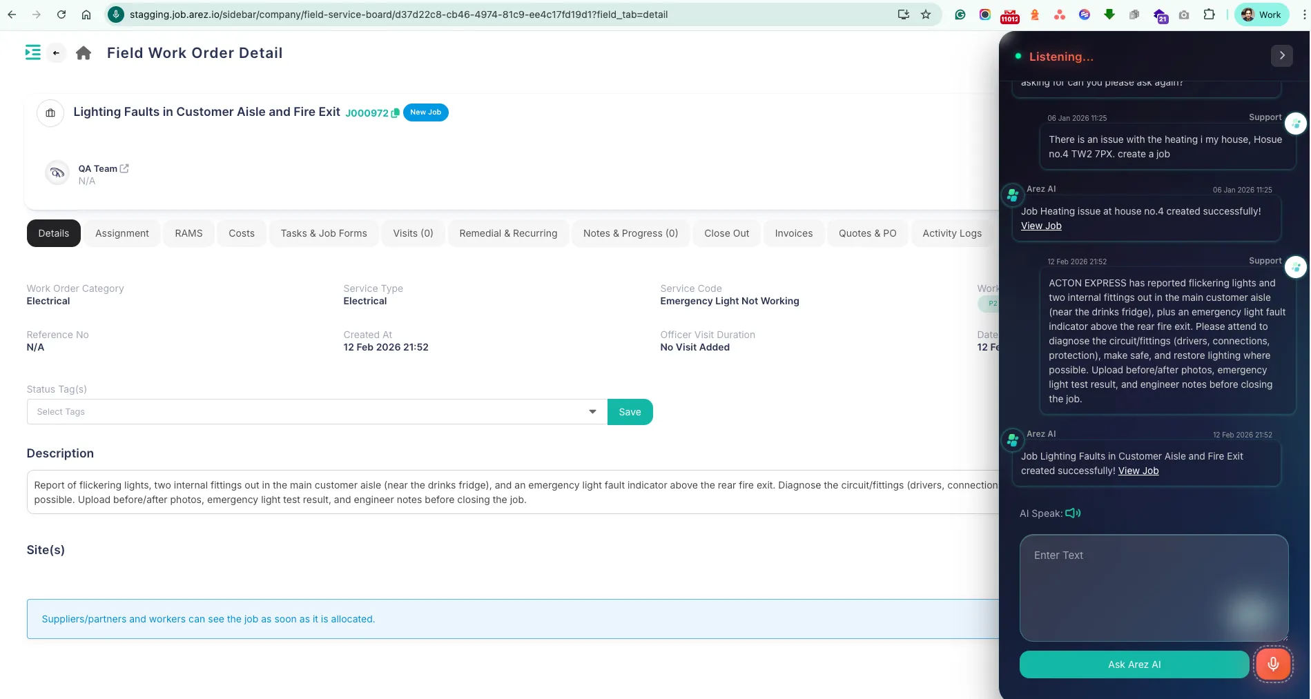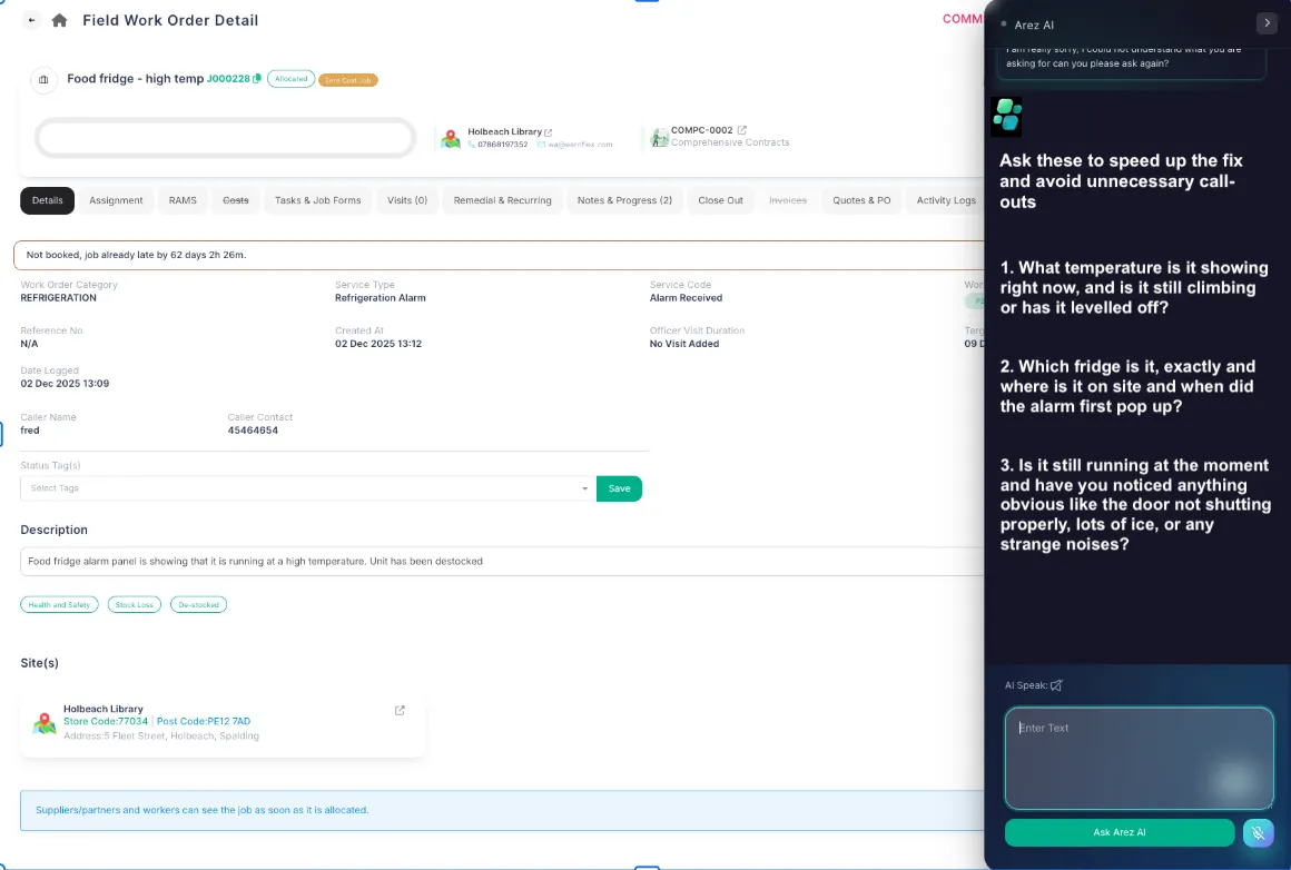 1. Auto-Triage: The Instant Filter When a job is created, Arez AI instantly reads the call notes and combines them with client and site context. In seconds, it recommends the decisions that most often lead to mistakes: the correct category and subcategory (HVAC, Gas, IFM), the appropriate urgency (P1, P2, P3), and the optimal supplier assignment based on skill fit, location, and past performance. Instead of "log now, fix later," the job starts clean.