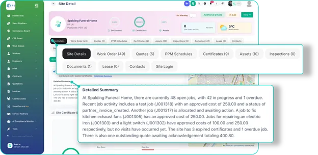 You can move from a full estate overview into a single location and immediately understand what’s going on, including work orders, quotes, PPM schedules, certificates, asset photos and information, inspections, lease information and site contacts. Everything sits in one place, structured around the site, so there’s no need to piece information together.